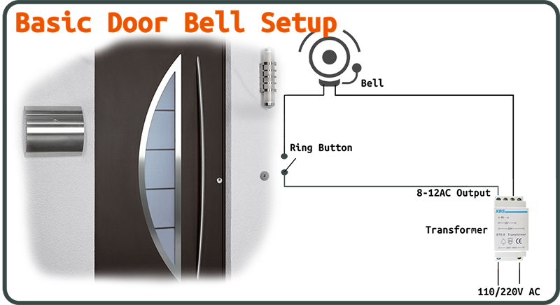 Lets scribble a basic Door Bell Setup. We got a transformer a Ring Door Push Button and the Bell. The important part is the Ring Bell Transformer which transforms the AC power 220/110V to a lower AC level. For the RFID-DOOR its important that the transformed AC level is max. 16V. Even if the RFID-DOOR can handle up to 24V most RFID Readers can only handle max 16V DC (But read more under pitfalls).