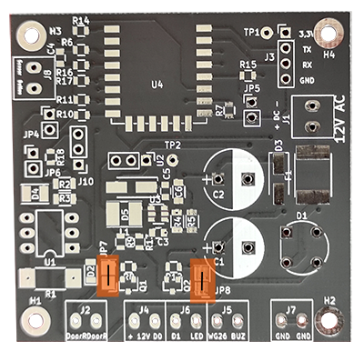 If your power source is 12V DC you don't need the Diode Bridge and the Capacitor Cxx to be soldered on the board. Solder the JP1 and JP2 Solder Bridge Jumpers.3,3V DO / D1 Wiegand Interface