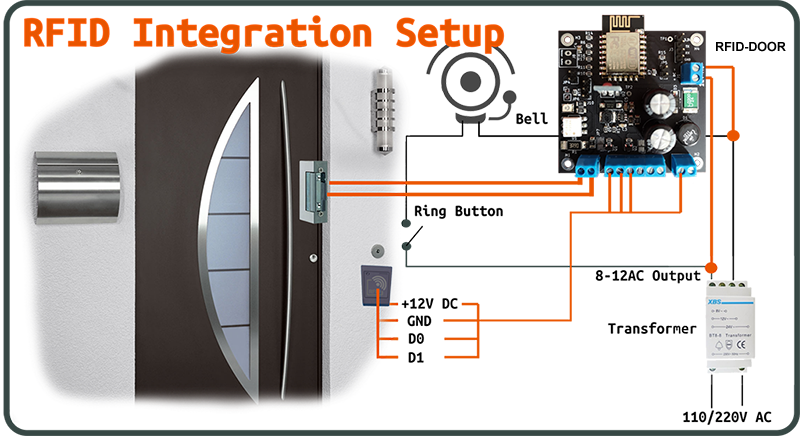 Be carefull with 12V AC Ring bell transformers. The DC Voltage after the Diode bridge can be around 18V DC!!! That will not kill the RFID-DOOR hardware but it will kill a 12V RFID Reader that is connected to the RFID-DOOR. Why is that happening most Readers have a build in AMS1117 Voltage regulator wich has a maximum 16V input. The RFID-DOOR transforms the AC input Voltage in three stages first Stage is a diode bridge to transform AC to rippled DC then a Step Down Regulator generates 5V DC that can handle 24V DC input next the 5V is converted to 3,3V with a AMS1117 for the ESP. The RFID-DOOR won't get killed because the AMS1117 lives behind the 5V StepDown stage. The Rippled DC is connected directly to the power reader connectors. The easiest way to get around that problem is using a 8V AC Ringbell transformer. For example someting like this: Just use the 8V instead of 12V. The rippled DC after the Diode Bridge on the RFID-DOOR device is around 14-15V and in the range a AMS1117 of the RFID-Reader can handle. Just for details about german standard and regulations for the bell transformer that has to be used. https://de.wikipedia.org/wiki/Klingeltransformator